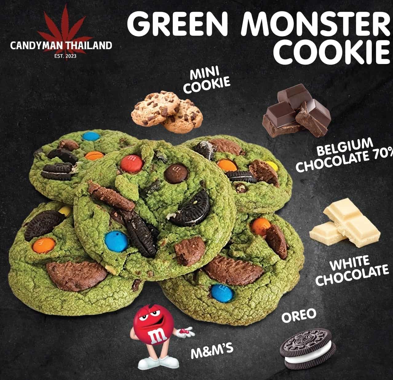 Ingredients: Wheat Flour, Butter, Sugars, Granulated, Brown Sugar, Egg, White Chocolate, Dark Chocolate 70%, Mini Chocolate Chips, Oreo Cookies, Vanilla Extract, Food Color Green, Baking Soda, Salt, M&M’s